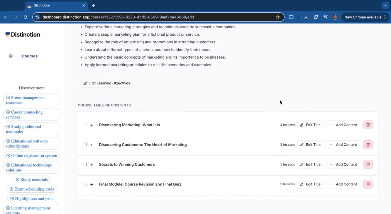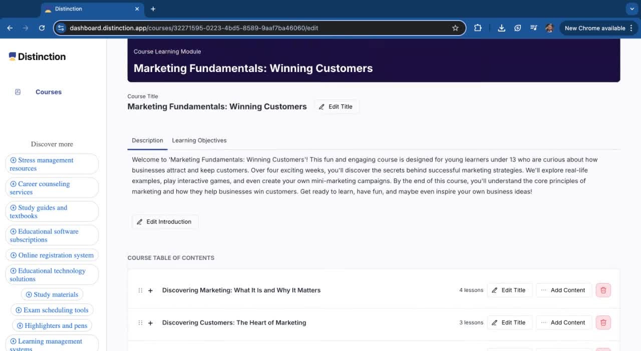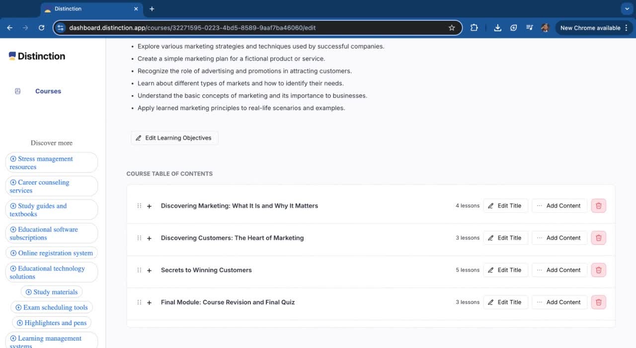 What is Distinction.app? Distinction.app is a platform that helps you create, publish, and manage online courses with ease. It’s designed for both independent creators and academic lecturers, giving you all the tools you need to teach, engage ...