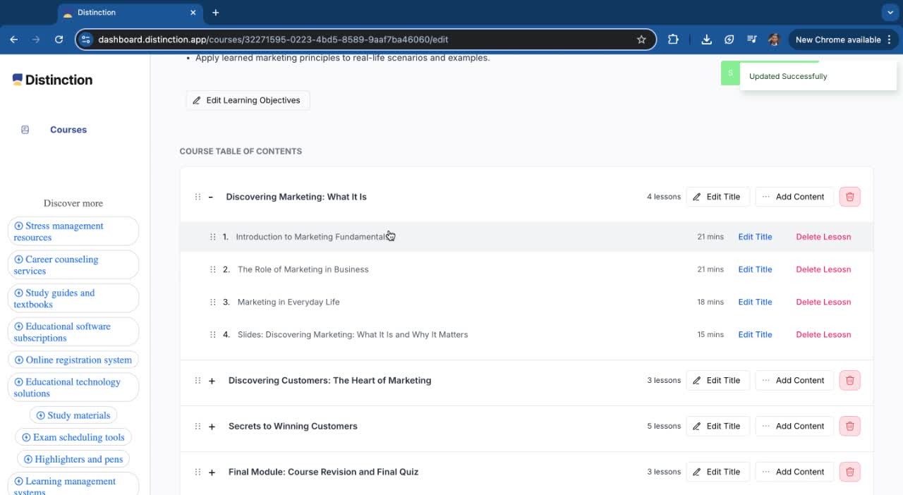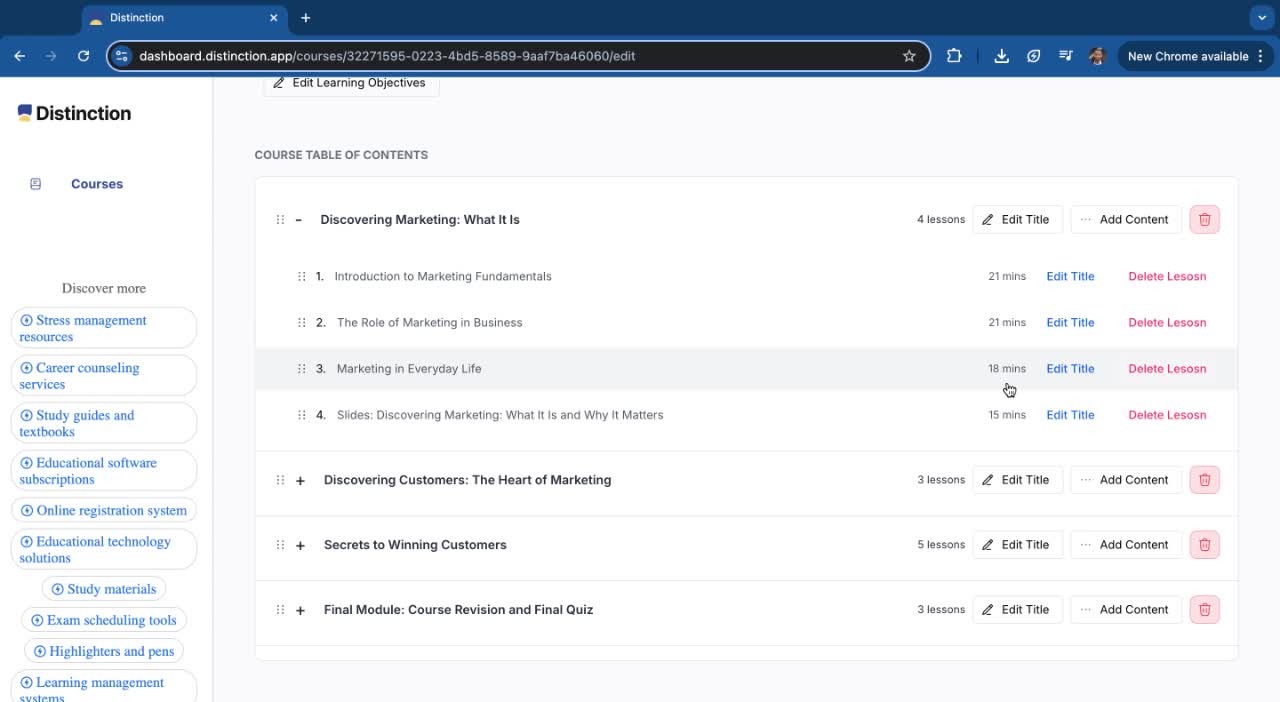 This section provides a guide for creators and lecturers on how to efficiently edit course content on Distinction.app. It covers updating articles, videos, flashcards, and quizzes, using AI prompts to improve content quality, adding images, and ...